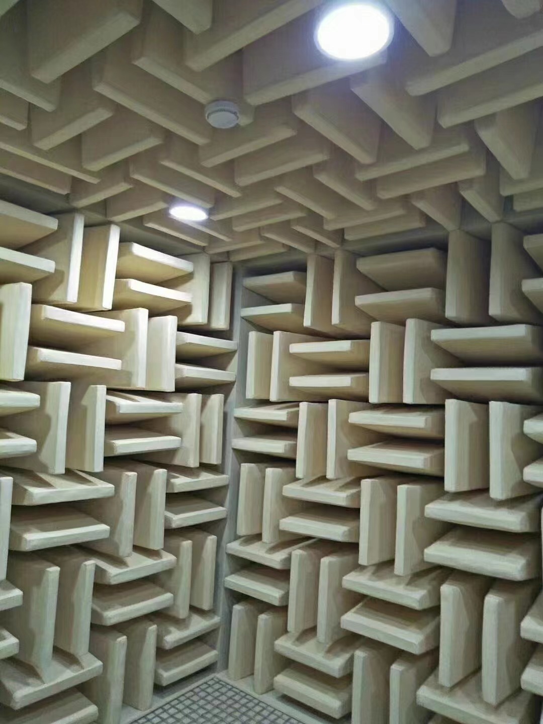 产品描述:半消声室为五个面是吸声面加地面为反射面的声学实验室,地面一般采用瓷砖或环氧地坪等近全反射表面材料,其他五个界面均安装有吸声结构,该吸声尖劈在截止频率以上频段吸声系数大于0.99。富程环保可以根据客户需要及其现有空间设计半消声室作为模拟半自由声场的声学实验室。富程吸声尖劈采用的特殊吸声结构是吸声尖劈段加低频平板吸声体的复合吸声结构。可有效吸收截止频率以上全频段声波,其中平板段吸声体吸收超低频的声波,使入射声波没有反射的进入后端共振吸声板结构,将声能转化为热能,将其全部吸收。
